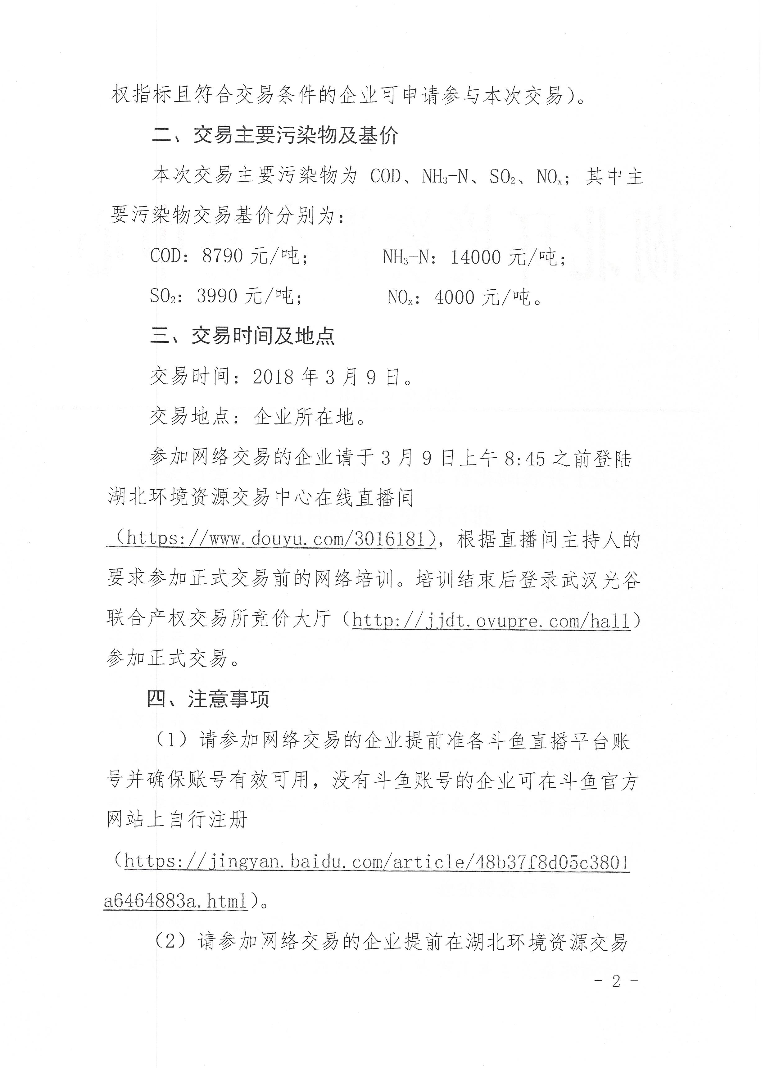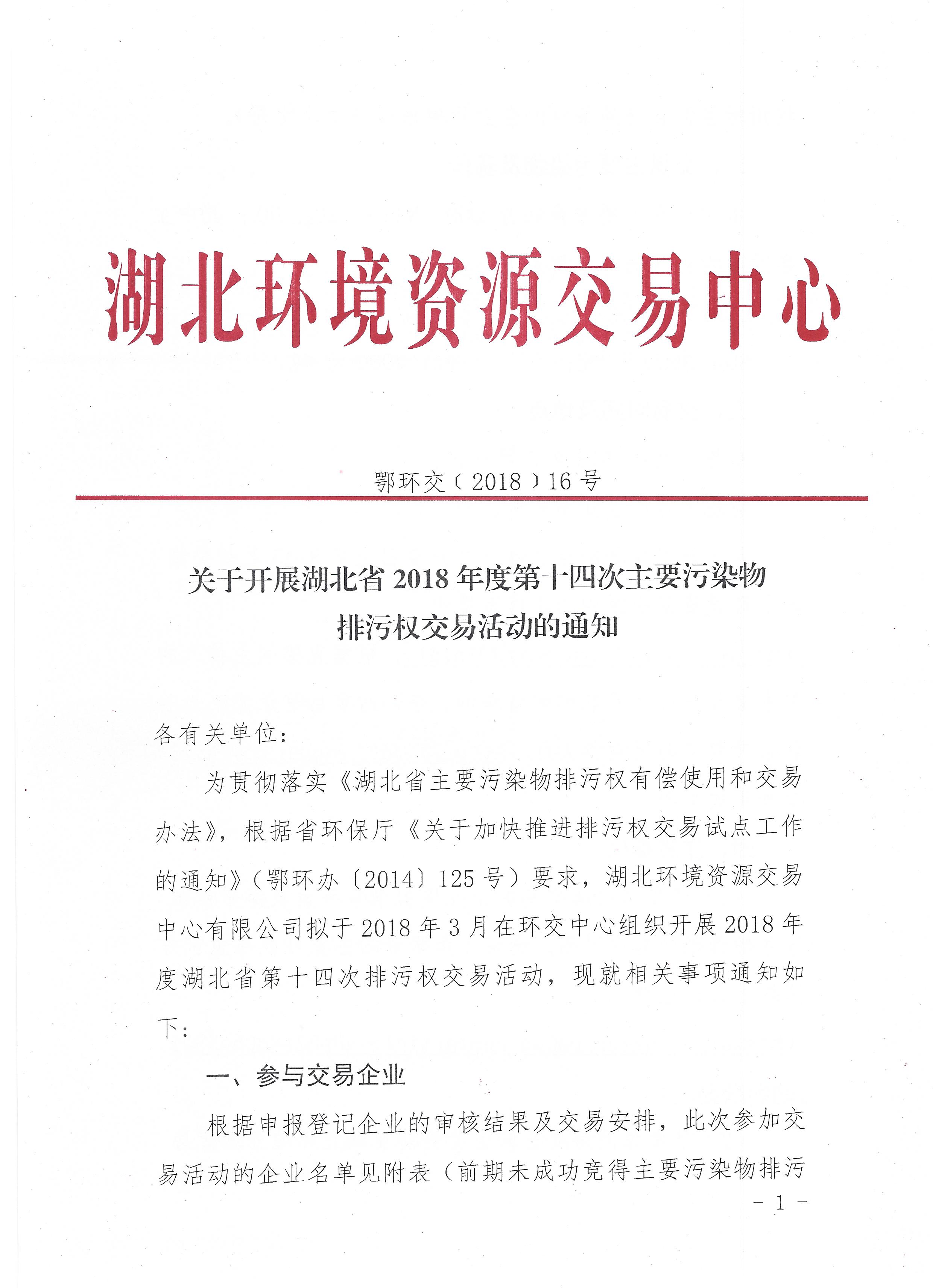 关于开展湖北省2018年度第十四次主要污染物排污权交易活动的通知