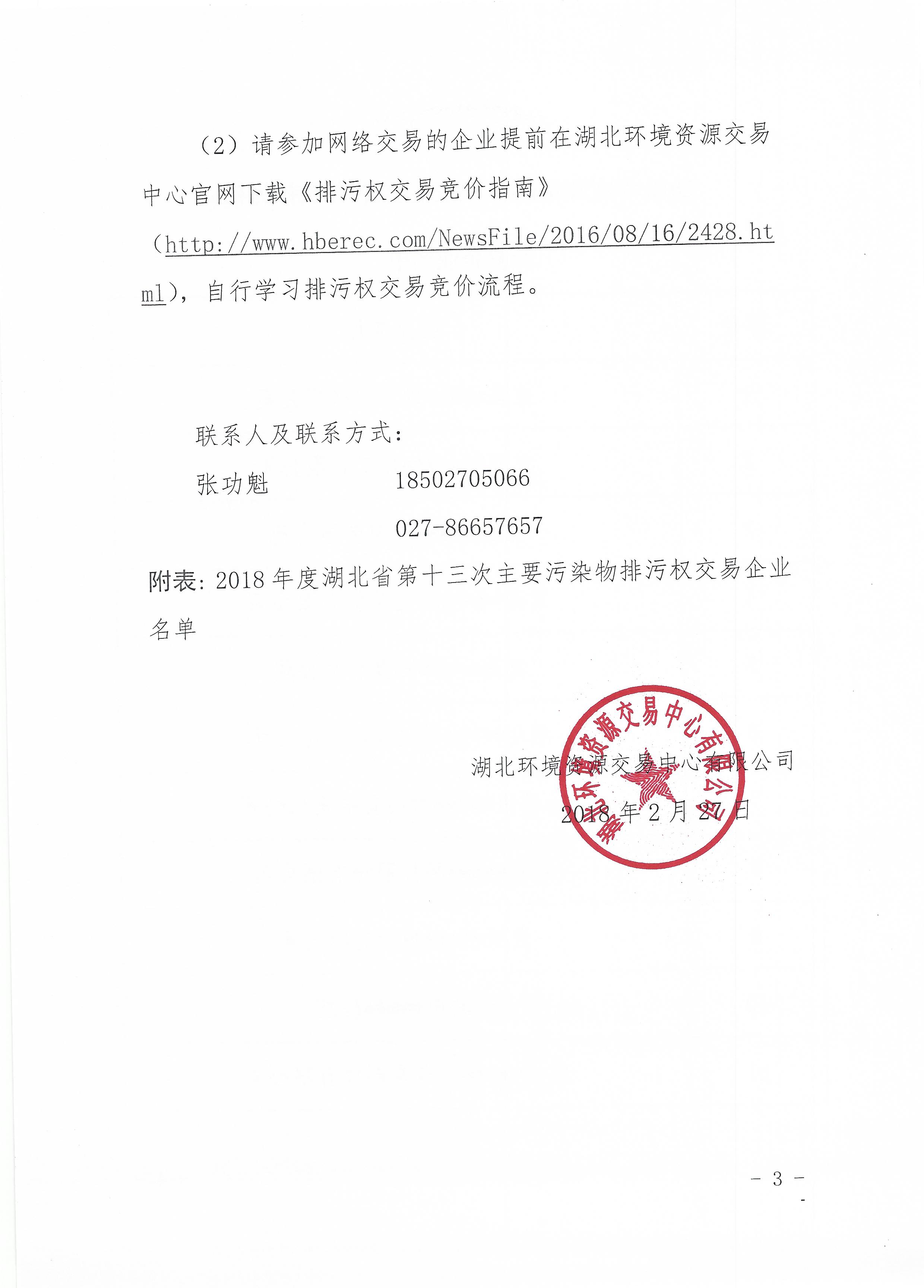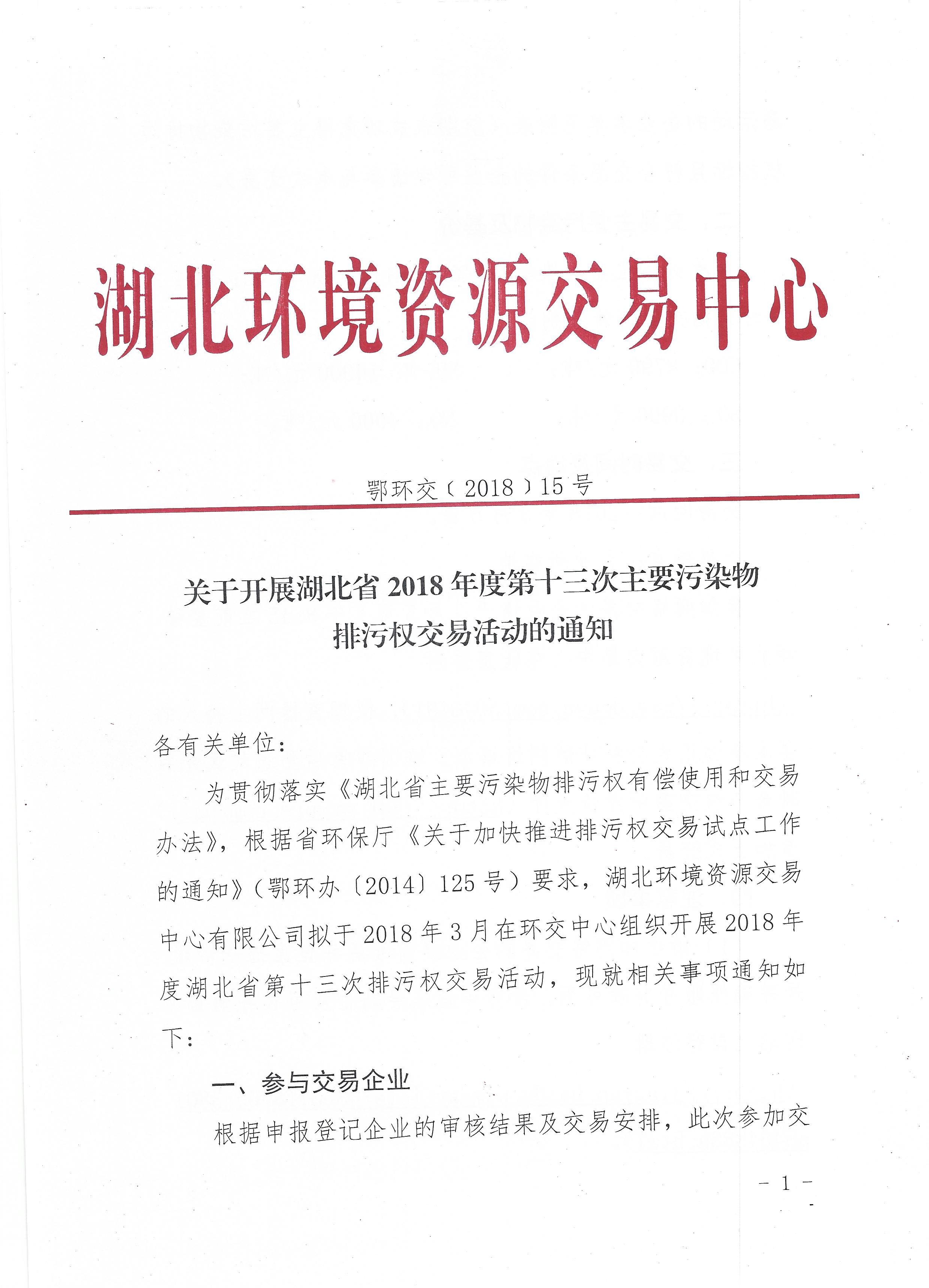 关于开展湖北省2018年度第十三次主要污染物排污权交易活动的通知