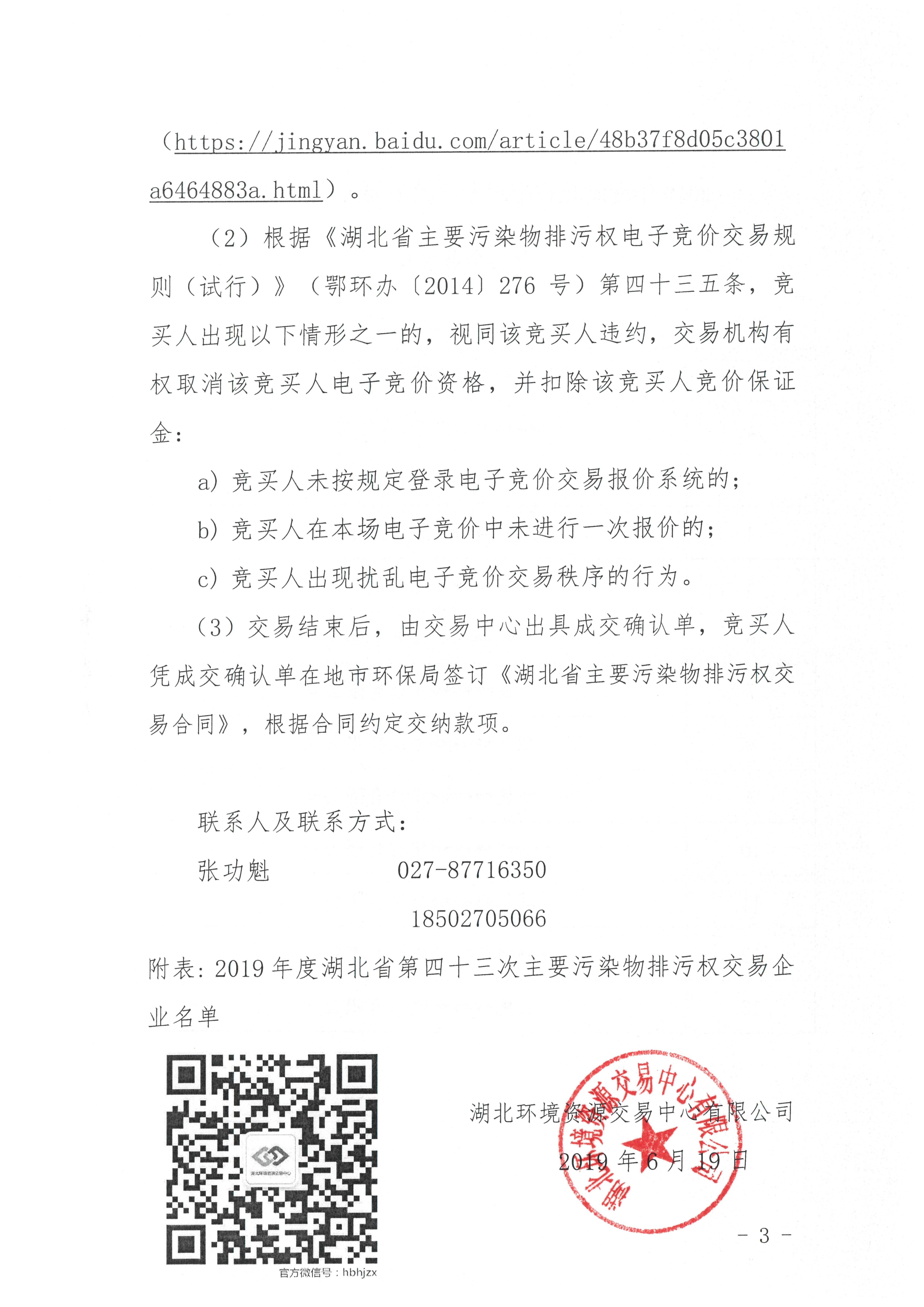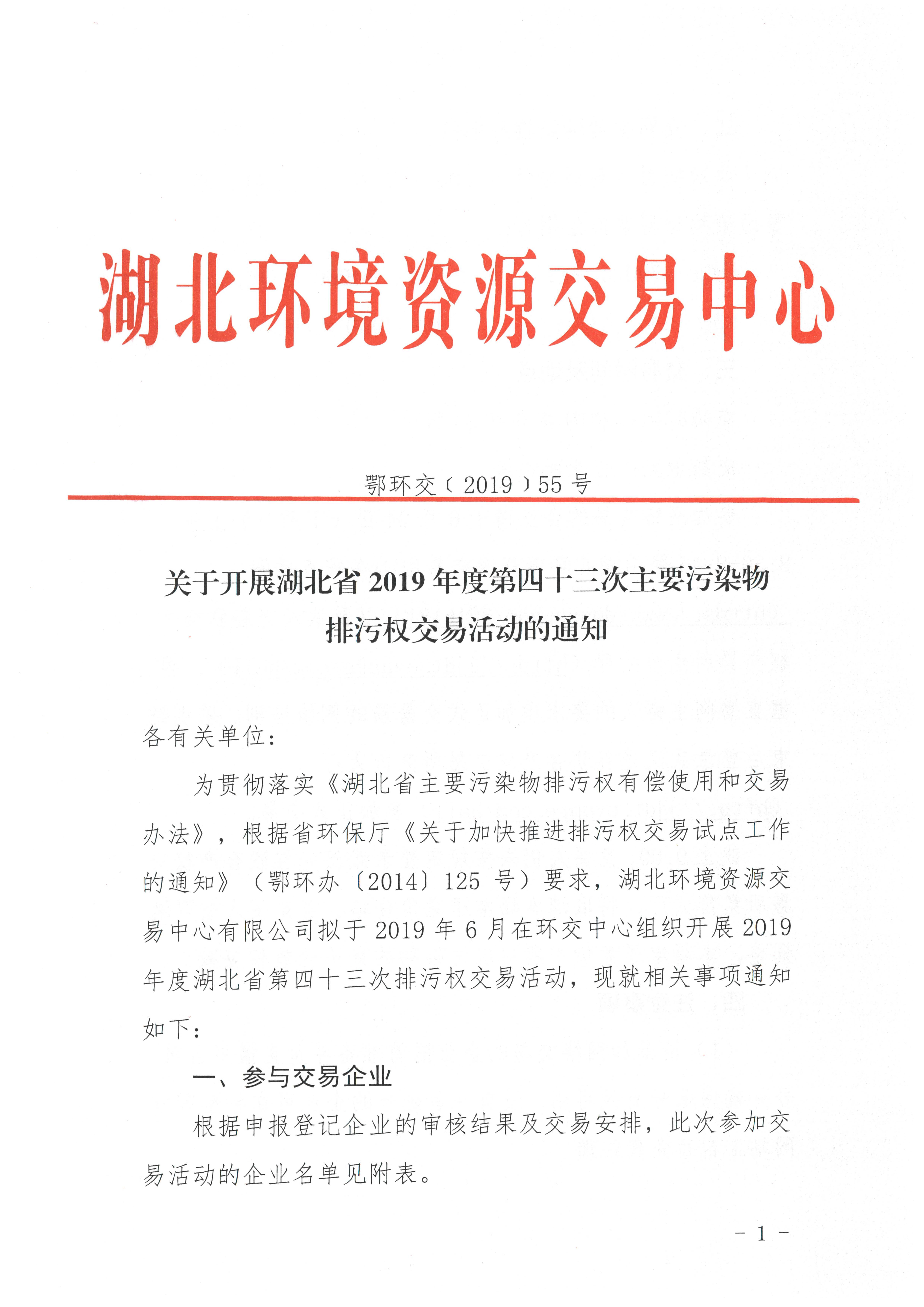 关于开展湖北省2019年度第四十三次主要污染物排污权交易活动的通知